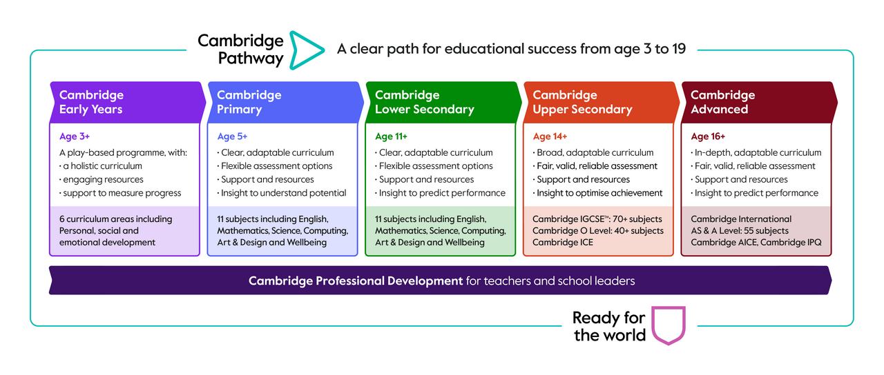 Cambridge pathway starts as early as 3-4 years old.  The younger you start your education journey the easier it is for the student to get a good basic about Cambridge pathway. Pine Hills International School will provide a clear educational path till age 16+. You may look at the diagram below  to further understand the stages and levels.